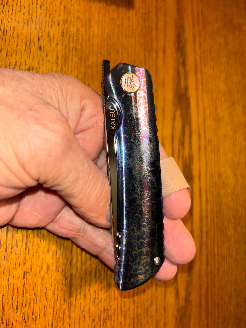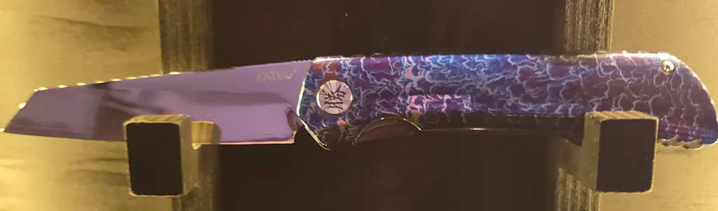 The Flamed Titanium Handle, now adorned with captivating cloud - like patterns, masterfully combines the exceptional strength and lightweight nature of titanium. These unique cloud - shaped textures, a result of a meticulous flame - induced process, not only add a visually striking appearance but also offer unparalleled durability.